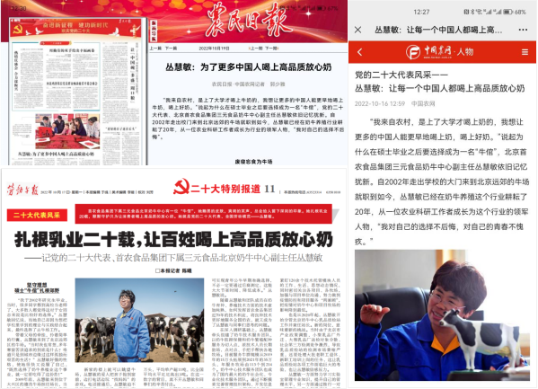 其中,农民日报、中国农网、劳动午报等分别以《丛慧敏:为了更多中国人喝上高品质放心奶》《党的二十大代表风采——丛慧敏:让每一个中国人都喝上高品质放心奶》《二十大代表风采|丛慧敏:扎根乳业二十载,让百姓喝上高品质放心奶》为题,对丛慧敏硕士毕业之后选择成为一名“牛倌”,在奶牛养殖行业耕耘20年,从一位农业科研工作者成长为行业的领军人物的经历和成绩进行了专版报道。