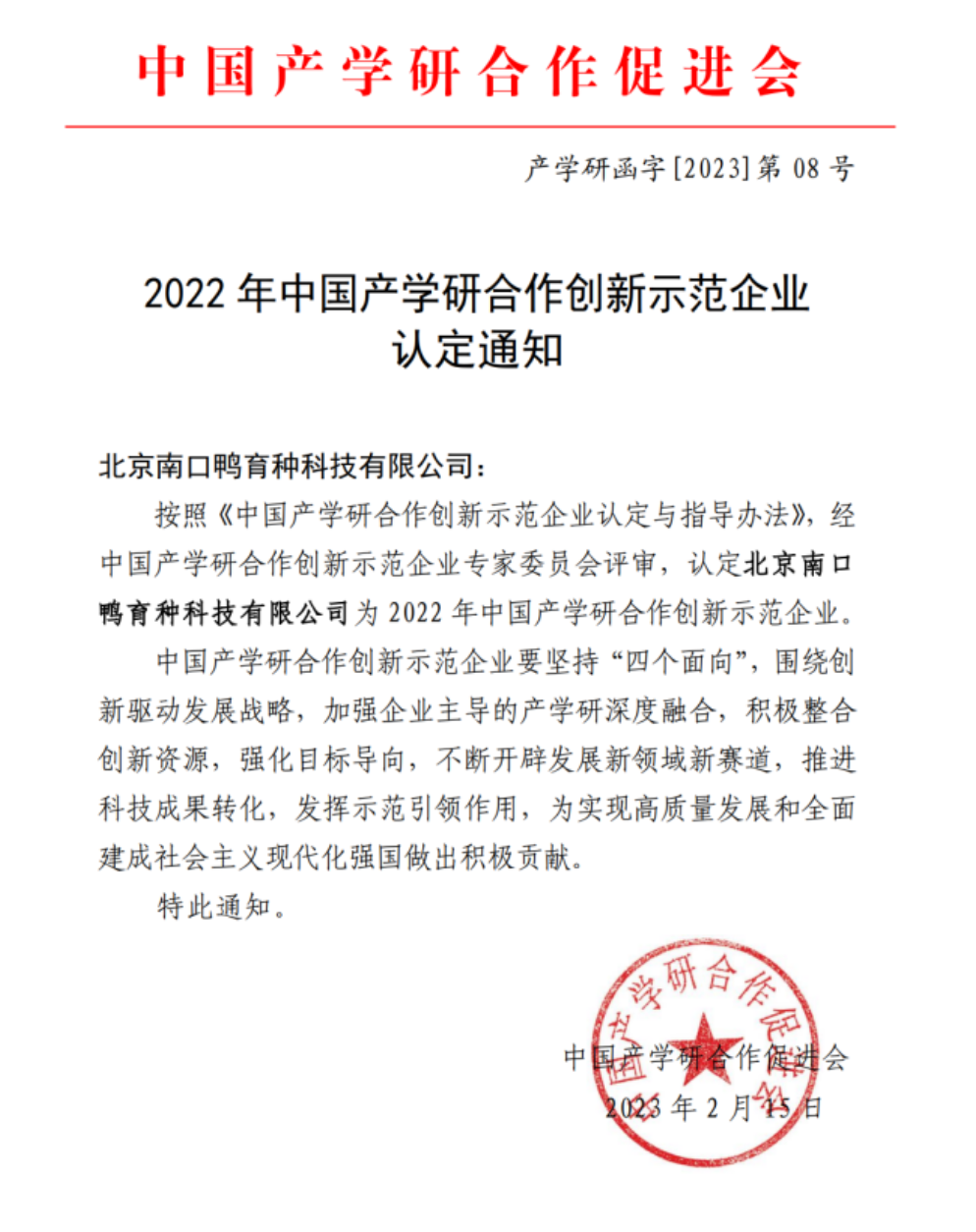 北京南口鸭育种科技有限公司 获评2022年中国产学研合作创新示范企业