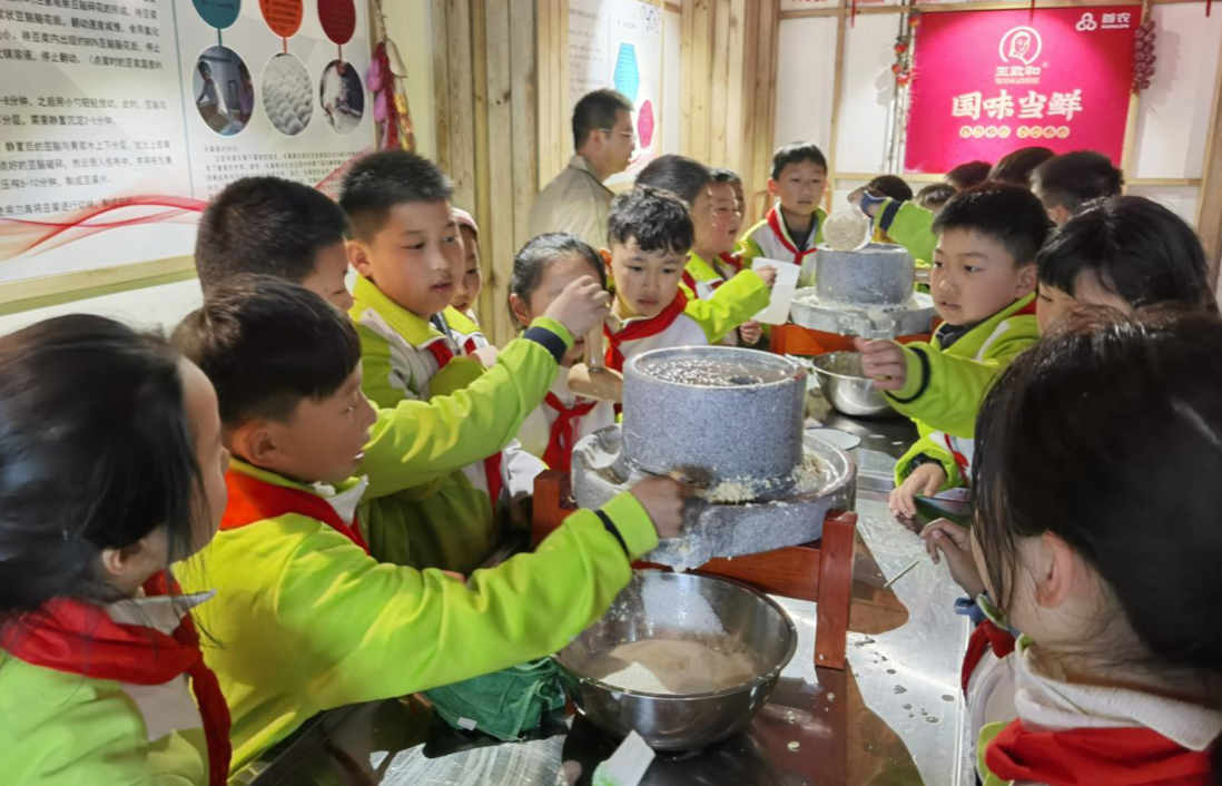 参观期间,孩子们兴致盎然地围在讲解员身边,从一楼展厅开始参观,认真聆听讲解,并不断同身边的小伙伴讨论。通过琳琅满目的实物资料和珍贵的历史档案,王致和的品牌历程及腐乳的发展史在孩子们眼前徐徐展开,使大家沉浸式感受到了中华传统饮食文化的独特魅力。在体验厅中,孩子们体验了从磨浆开始的整个腐乳生产流程。虽然王致和腐乳在日常生活中随处可见,但其制作流程却不常见,孩子们一拥而上积极动手尝试,亲身体会到了制作过程的严谨和复杂。在体验厅的品尝区,孩子们品尝了王致和各种口味的腐乳,在放映厅观看了腐乳的科普宣传片,立体、完整地了解王致和腐乳的历史与未来。