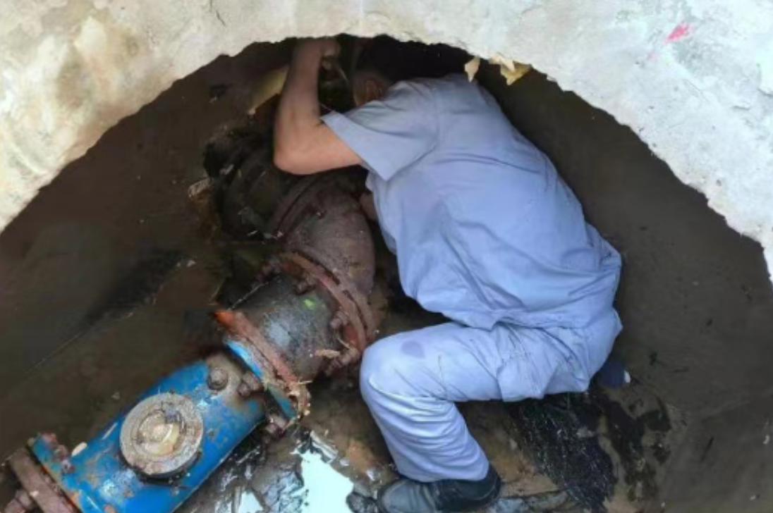6月19日早晨,北郊农场所属龙冠物产经营分公司工程部接到报修电话,公司所辖龙冠商务中心项目部工作人员在日常巡视中发现一处自来水供水管井内有积水,将积水抽干后进行排查发现是井内墙体开裂处向井内漏水,渗漏速度快,初步判断是地面下沉造成直径300MM的自来水主供水管线变形开裂导致漏水。现场急需挖开地面,查找漏水点位并进行维修。
