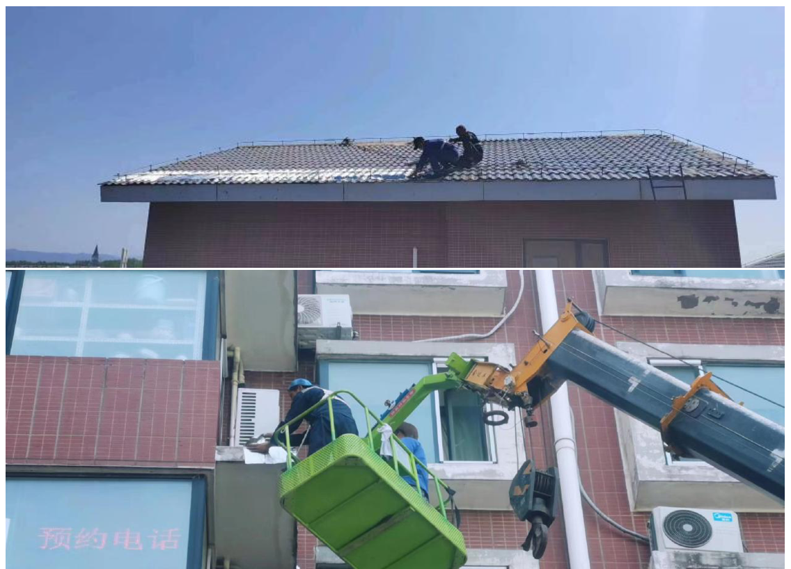龙冠物业回龙观项目部所服务的回天地区龙泽园街道冠庭园小区为老旧小区,因建设年代久远,部分居民楼出现了空调安装平台砖面脱落、平台存在裂纹、楼顶瓦有缺失的情况。为了进一步提高业主幸福感,保证业主的生命财产安全,龙冠物业主动自筹资金两万余元,针对上述居民楼进行了修缮:对空调平台进行加固并维修砖面和加装防水层,对楼顶瓦片进行重新铺设。