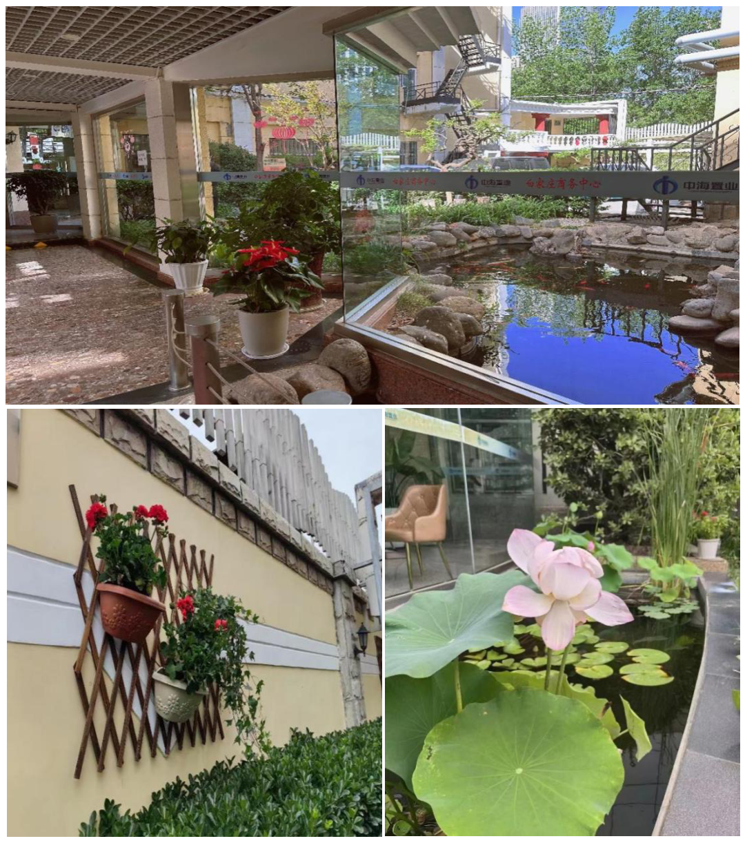从绿植的选种到规划栽种范围,每一步都汇集了全体职工的智慧。园区内桂花树、碧桃树、海棠树和灌木错落有致,工作人员定期进行更新补种,及时修剪树木枯枝及密枝叶,使园区底色更加靓丽;园区内墙壁上采取加装木花架、鲜花上墙的方式,为客户创造优美舒适的办公环境;园区内池塘中有工作人员精心喂养的锦鲤游动其中,成为了一道美丽的风景线。池塘里的水波微微荡漾,几朵美丽的荷花静静地绽放着,荷叶上的水珠随风摇来摇去,为职工、客户和来访的客人营造出雅致的环境。