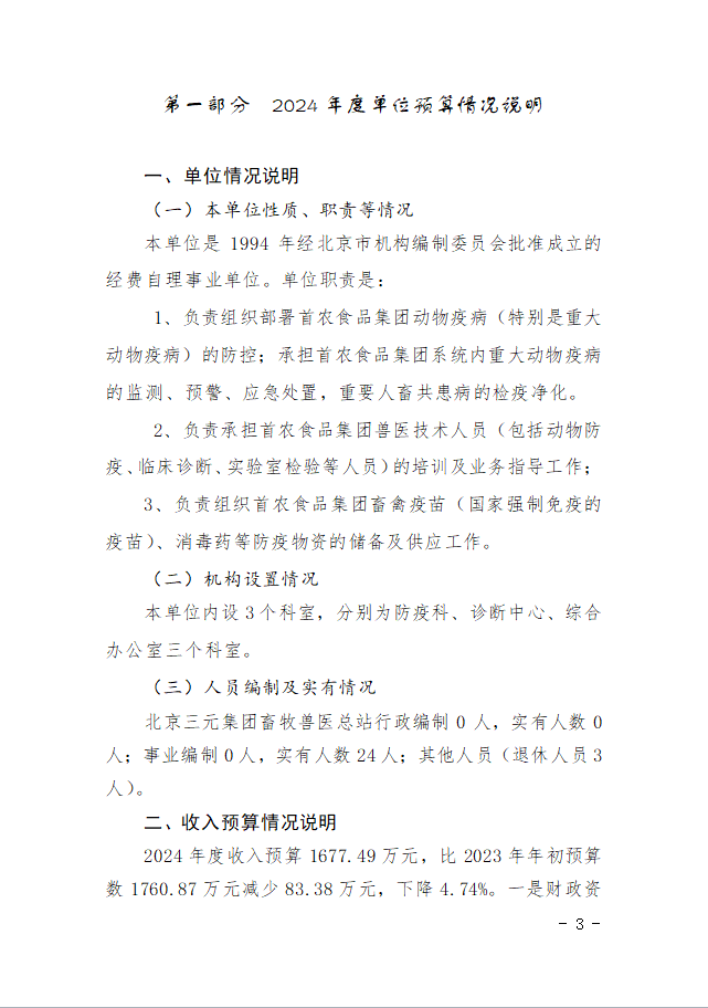 北京三元集团畜牧兽医总站 2024年部门预算情况的说明